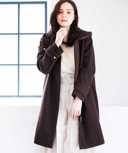 衿元から続いたスタンドフードが顔周りを華やかに見せてくれるデザインのウールコート。フロントを閉じてフード周りを立てて着用すれば少しカジュアルな印象に、フードのドット釦を外して衿周りを開けて着れば女性らしい印象で着用していただけます。程良い厚みのある素材はパイル加工によって風合いのやわらかさと表面感を出し、より女っぽい暖かみのある印象に。※屋外での撮影は色味が多少異なる場合がございます。商品の色味は、スタジオ撮影の画像をご参照ください。 ※サンプルでの撮影となるため、実際にお届けする商品と仕様やサイズが異なる場合がございます。