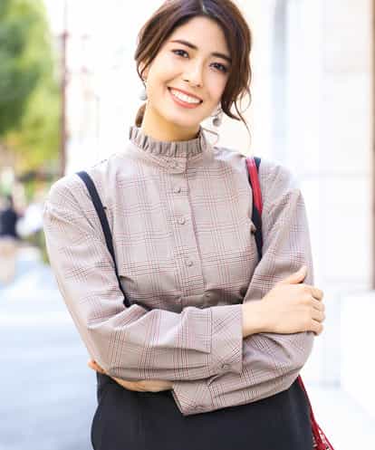 チェック柄フリルネックブラウス[WEB限定サイズ] ベージュ 36