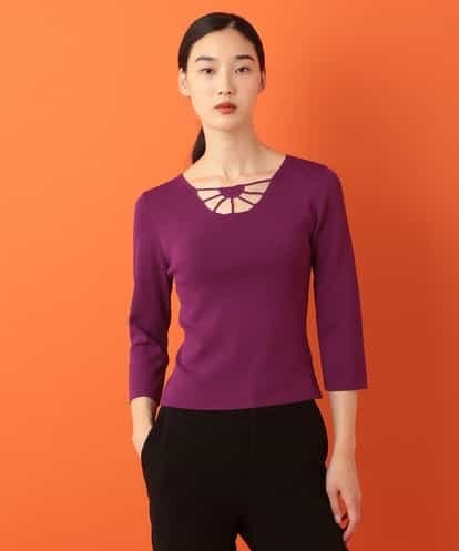 アセテート混の独特な風合いが魅力の糸で編み立てたニットプルオーバー。コンパクトなシェイプに、七分袖のすっきりとしたバランスが大人なニットアイテムに仕上がっています。胸元には透け感を残してあしらったディティールが女性らしさをさらに引き立ててくれるアクセントになっています。同じテキスタイルで仕立てた【GBSJD08390】もお薦めです。model:H173 B80 W58 H84 着用サイズ:M