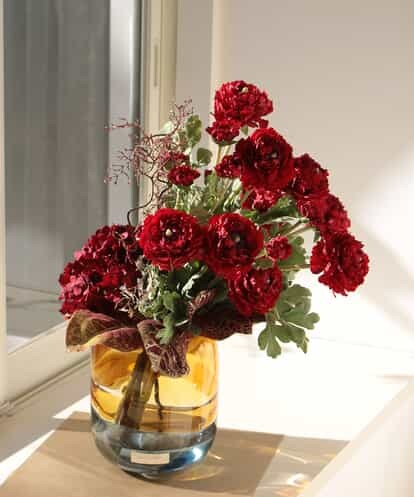 情熱的なレッドカラーが印象的なラナンキュラス・ハイドランジアのアレンジ。※巧妙な造りのアートフラワーです。お水を必要としませんので特別なお手入れがいらず長期間お楽しみいただけます。※お品物の変色・老化を防ぐ為、湿度差の激しい場所や火気暖房器具の熱、直射日光の当たる場所には置かないでください。※掲載写真の色やサイズが多少異なる場合もございます。※こちらの商品は、宅急便(通常サイズ)にて配送を承ります。 詳しくはこちらをご参照ください。