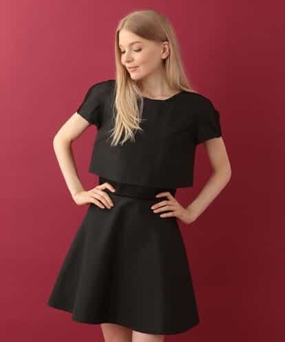 コットンやアセテートをミックスして織り上げた、ハリのある光沢感が魅力のテキスタイルで仕立てたドレスです。上下でセパレートになったようなツーピースデザインを、内側はジャージーでドッキングしたワンピースドレスです。ショルダーやウエスト部分にはサテン地を組み合わせ、ジャカードで表現した細やかなドット柄がエレガントに映えるコンビネーションで仕上げました。特徴的な設計のトップスに、緩やかに広がるフレアスカートのバランスが上品な一着です。※バックファスナー、裏地付きmodel:H170 B81 W59 H88 着用サイズ:M