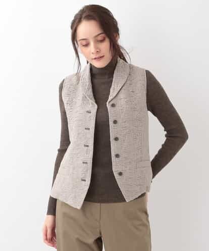 風合いのあるコットンダブルガーゼで仕立てたジレです。コットンガーゼの柔らかな質感に、シャーリングステッチで描いた柄が立体感のある表情を魅せてくれる一着です。モードなショールカラーに、ウッド調のデザインボタンやさりげないストライプ柄の裏地もアクセントに。同じテキスタイルで仕立てた【NGDJD30330】もお薦めです。※裏地付きmodel:H165 B79 W60 H88 着用サイズ:M