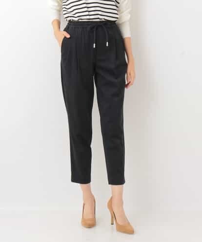 エレガントな風合いのテキスタイルで仕立てた、上品なタッチのパンツです。ダブルタックのゆったりとしたもも周りに裾にかけてテーパードをかけたシルエットが、トレンド感のあるバランスのボトムスに仕上がっています。ウエストは総ゴムで仕上げたラフに穿けるイージーな仕様に、紐のエンドにはメタルパーツをあしらいアクセントをプラスしました。model:H170 B80 W59 H85 着用サイズ:M