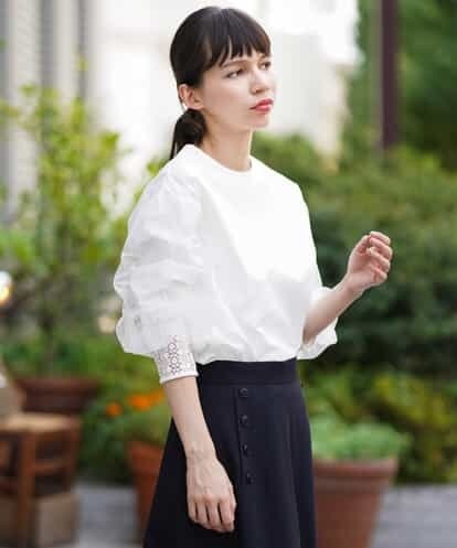 ハリのあるコットンで仕立てたプルオーバーブラウスです。ギャザーを寄せて切り替えた、フェミニンムード満点のチュールを重ねたデザインスリーブが魅力の一着です。カフスはレースをあしらい、バックにはデザインボタンがさりげないアクセントになっています。model:H167 B80 W58 H87 着用サイズ:M