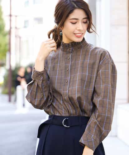 チェック柄フリルネックブラウス[WEB限定サイズ] キャメル 36