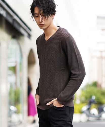 【洗える】Vネックケーブルニット ダークブラウン 48