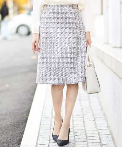 ■セレモニーおすすめアイテム■尾州産地で作ったブランドオリジナルのファンシーツイード。モノトーン系カラーの白系は真白と生成、黒系は真黒とグレーを使い深みのある高級感のある色合い、ピンク系カラーは落ち着いたピンクとベージュをミックスして上品なカラーに仕上げました。シンプルなAラインシルエットの膝丈スカートで、少し広がった裾廻りのおかげで足もほっそりと綺麗に見せてくれます。同素材ジャケット▼FMDDG01330とのセットアップでの着用はもちろん、お手持ちのブラウスと合わせての着まわしも可能です。※屋外での撮影は色味が多少異なる場合がございます。商品の色味は、スタジオ撮影の画像をご参照ください。
